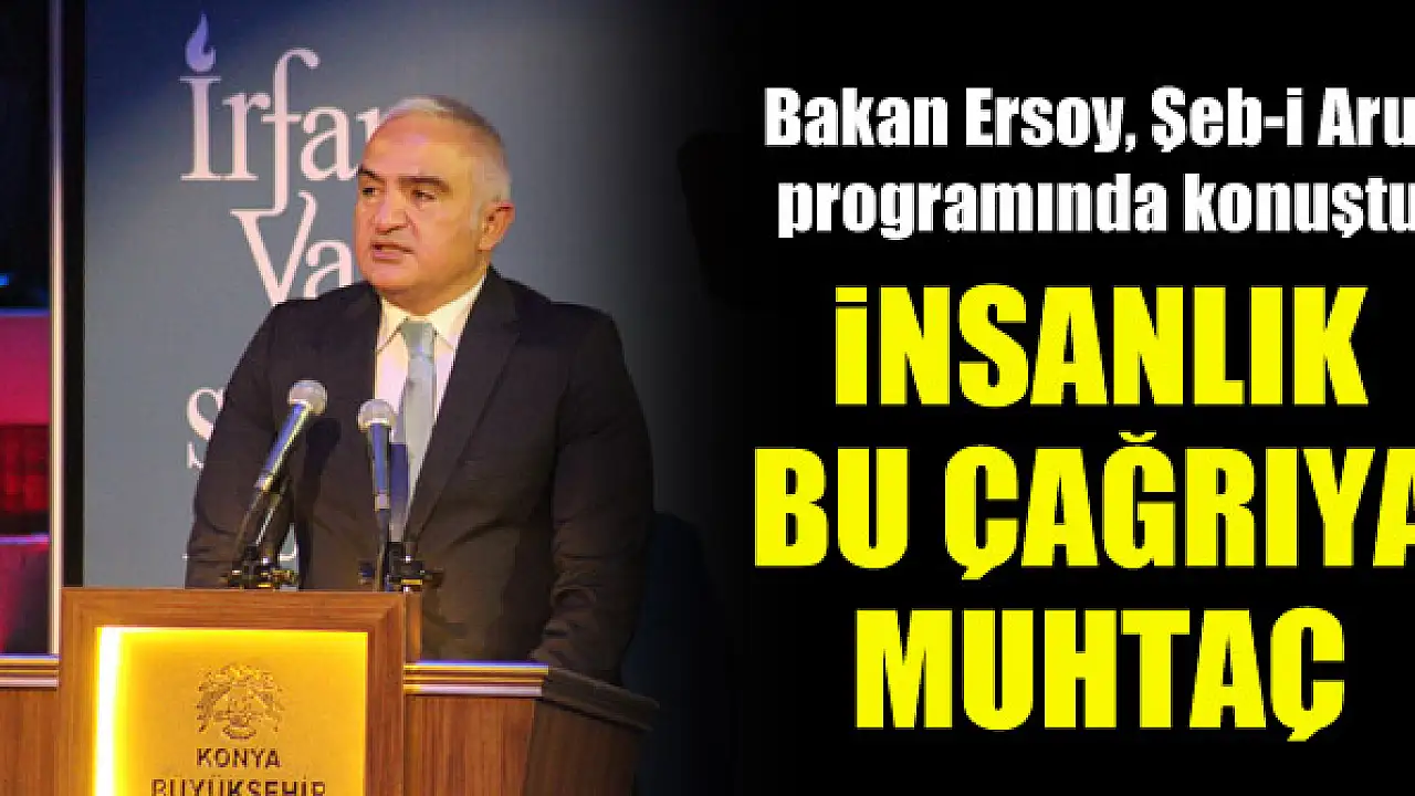 Konya'da, Hz. Mevlana'nın 748. Vuslat Yıl Dönümü Uluslararası Anma Törenleri'nin kapanış gecesi düzenlendi. Programa katılan Kültür ve Turizm Bakanı Mehmet Nuri Ersoy, 'Bugün dünyanın içinde bulunduğu durum, insanlığın O'nun merhamet ve muhabbet çağrısına ihtiyaç duyduğunun açık bir şekilde göstermektedir. Bu çağrıyı, bu mesajı zaman, mekan, sınır tanımadan farklı coğrafyalara, farklı toplumlara ulaştırmak, bizim en temel görevlerimiz arasında yer almaktadır. İnsanlık gerçekten bu çağrıya muhtaç' dedi.