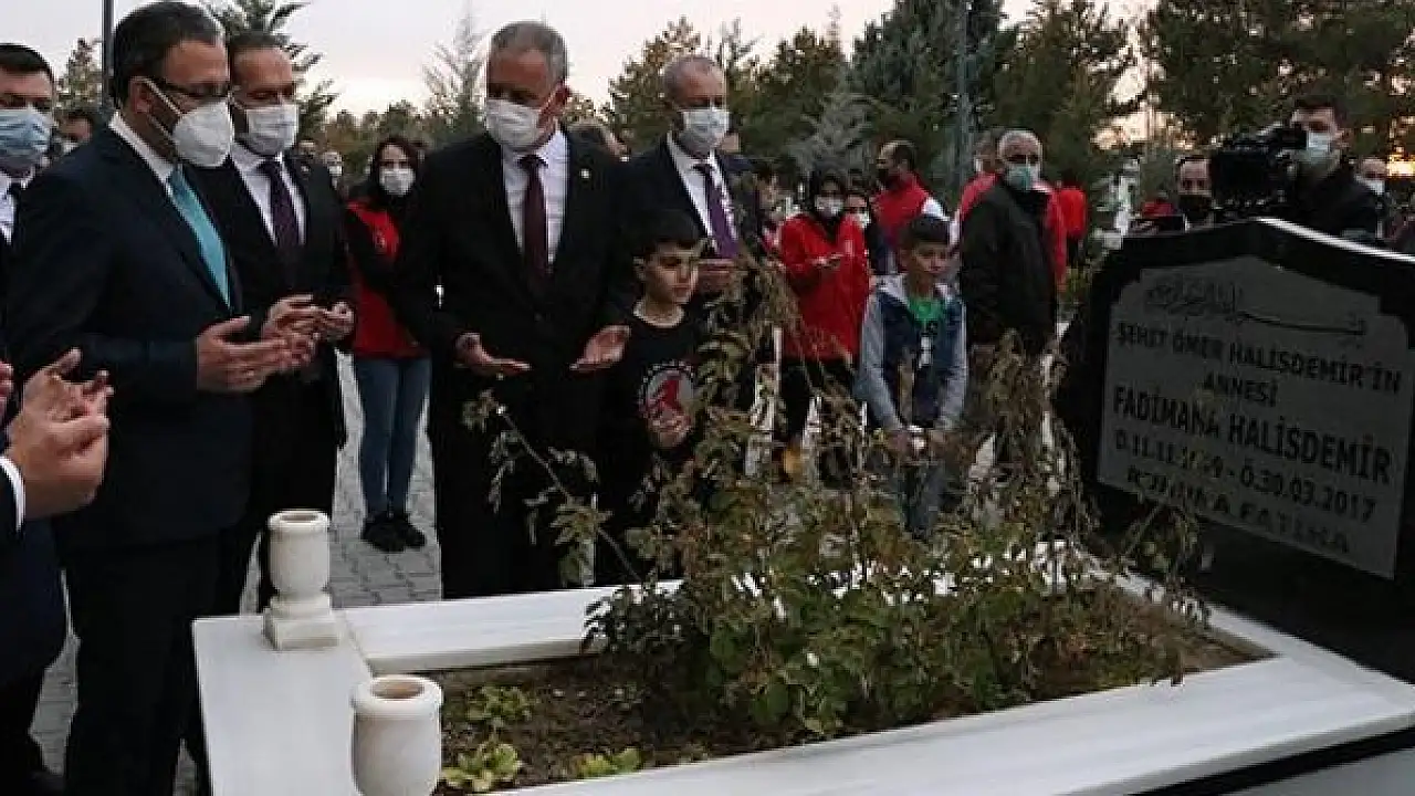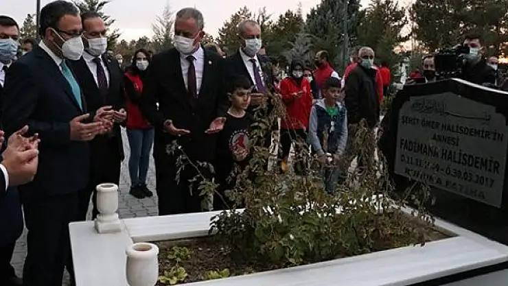 Şehidin kardeşi Doğan Halisdemir'le sohbet eden Kasapoğlu, annesi Fadimana Halisdemir'le de kabristandaki 2 şehidin mezarında dua okudu.