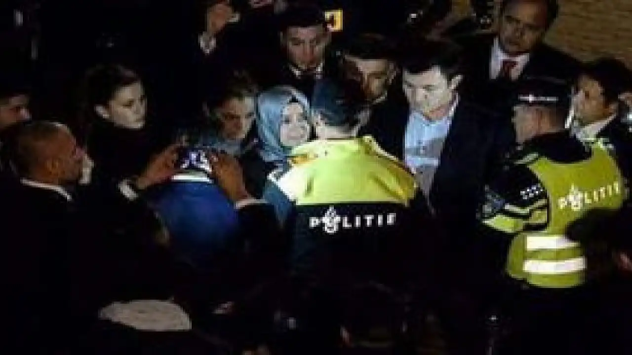 Hollanda'nın devlet televizyonu NOS, Twitter adresinden Bakan Fatma Betül Sayan Kaya'nın arabaya bindirildiği o anlara ait bir fotoğrafı yayınladı. Fotoğrafta aracın ön koltuğunda Hollanda polisinin olduğu görülüyor.