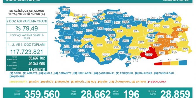 Türkiye'de son 24 saatte 359 bin 560 COVID-19 testi yapıldı, 28 bin 662 kişinin testi pozitif çıktı, 196 kişi yaşamını yitirdi. Sağlık Bakanı Fahrettin Koca, aktif vaka sayısının yaklaşık 450 bin 126 olduğunu açıkladı.