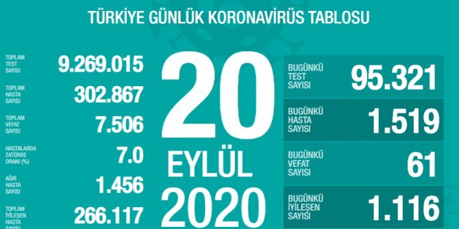 Bugünkü verilerle, toplam test sayısı 9 milyon 269 bin 15, toplam hasta sayısı 302 bin 867, toplam vefat sayısı 7 bin 506, hastalarda zatürre oranı yüzde 7, ağır hasta sayısı 1456, toplam iyileşen hasta sayısı 266 bin 117 oldu.