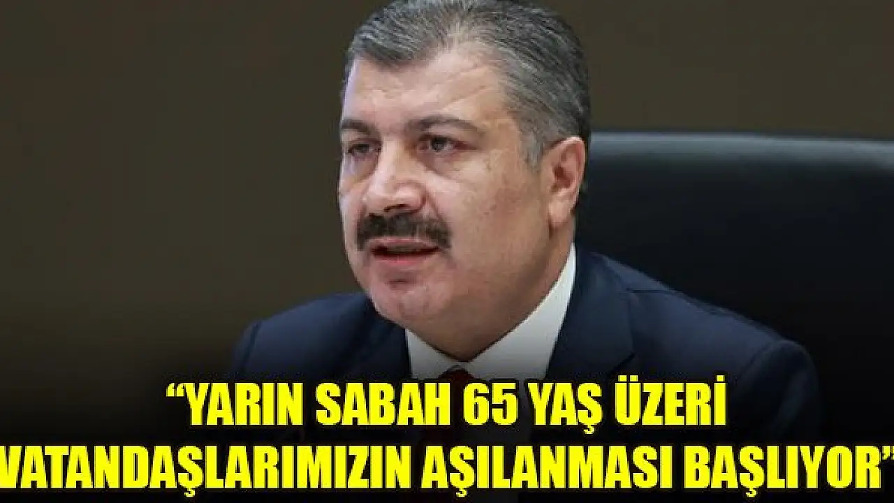 Sağlık Bakanı Fahrettin Koca, 'Yarın sabah 65 yaş üzeri vatandaşlarımızın aşılanması başlıyor. 65 yaş üzeri vatandaşlarımızın 60 yaş üzeri eşleri de aşı olabilecekler. Randevularınızı web sayfamızdan ve mobil uygulamadan almanızı rica ederim' dedi.