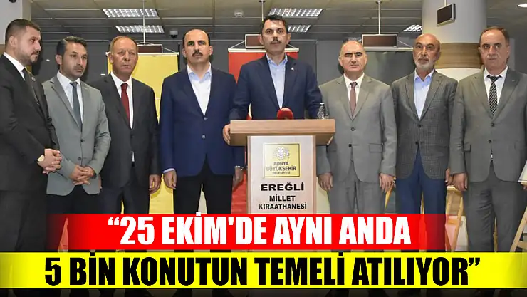 AK Parti Ereğli İlçe Teşkilatı'nı ziyaret eden Çevre, Şehircilik ve İklim Değişikliği Bakanı Murat Kurum, ilçe merkezindeki esnafları ziyaret etti. Bakan Kurum daha sonra Büyükşehir Belediyesi Ereğli Hizmet Binası'nda muhtarlarla bir araya geldi. Programlarının ardından Bakan Kurum basın mensuplarına açıklamalarda bulundu. 25 Ekim'de 5 bin konutun temelinin atılacağını duyuran Bakan Kurum, "13 Eylül'de milletimize müjdeledi. Gençlerimizin, emeklilerimizin, şehit ve gazi ailelerimizin, genç kardeşlerimizin kontenjanlarının olduğu ve rekor başvuru sayısına ulaştığımız projemizi de kararlı bir şekilde yürütüyoruz. Burada Cumhurbaşkanımız, bir müjdeyi daha milletimizle paylaştı. Alt yapısı hazırlanmış arsa sayısını 1 milyona çıkardı. 1 milyon konut yapılacak arsamızı, alt yapısını, elektriğini, suyunu, yolunu yapmak suretiyle vatandaşımızın hizmetine sunacağız. Bize de vakit kaybetmeden inşallah arsalarımızı illerde belirlemek suretiyle vatandaşımızın gerek kira noktasında gerek konut fiyatlarının düşme noktasındaki bu kararlı adımımızı 81 ilimizde 622 ilçemizde atmış olacağız. 25 Ekim'de de aynı anda 5 bin konutluk temelimizi atıyor olacağız." dedi.