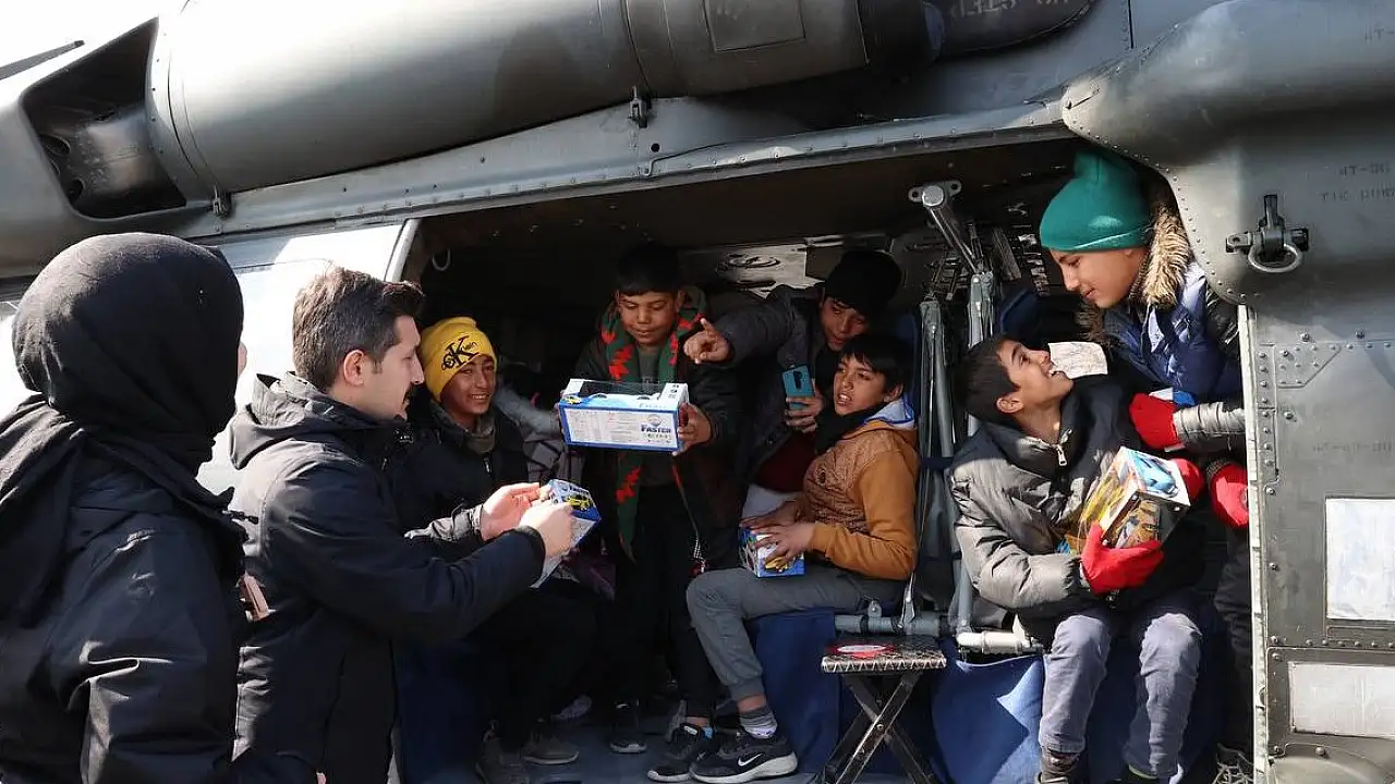 Bölgeyi gezerken Bakan Kurum'un yanına gelen 9 çocuk, helikoptere binmek istediklerini söyledi. Çocukların isteğini geri çevirmeyen Kurum, alan incelemeleri için kullandığı, Jandarma Genel Komutanlığı'na ait helikoptere binmelerini sağladı.