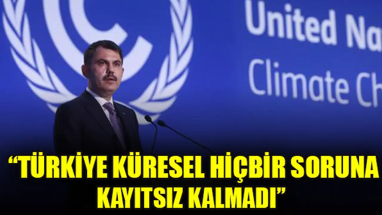 Bakan Kurum, Türkiye'nin küresel hiçbir soruna kayıtsız kalmadığını söyledi. Birleşmiş Milletler İklim Değişikliği Çerçeve Sözleşmesi 26. Taraflar Konferansı'nda konuşan Kurum, 'Küresel hiçbir soruna, krize, çağrıya kayıtsız kalmadık' dedi.
