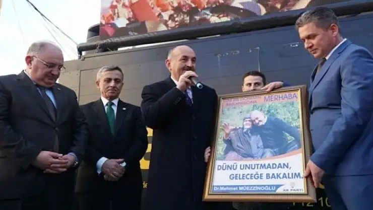 Edirne programı kapsamında Keşan ilçesine gelen Çalışma ve Sosyal Güvenlik Bakanı Mehmet Müezzinoğlu, AK Parti Keşan İlçe Teşkilatının yeni hizmet binasının açılışını gerçekleştirdi. Açılış öncesi parti binası önünde toplanan kalabalığa hitap eden Bakan Müezzinoğlu’na konuşmanın sonunda AK Parti Keşan İlçe Başkanı Hüseyin Boyalık tarafından 2011 yılında Edirne’den milletvekili adayı olduğu süreçteki afişin yer aldığı çerçeve hediye edildi. Edirne Milletvekilliği ve Sağlık Bakanlığına kadar uzanan sürecin başlangıcı olan ve 2 yıl önce vefat eden Saliha Gül’le çekilmiş fotoğrafını alan Müezzinoğlu, o fotoğrafla ilgili anısını ise şu sözlerle anlattı: