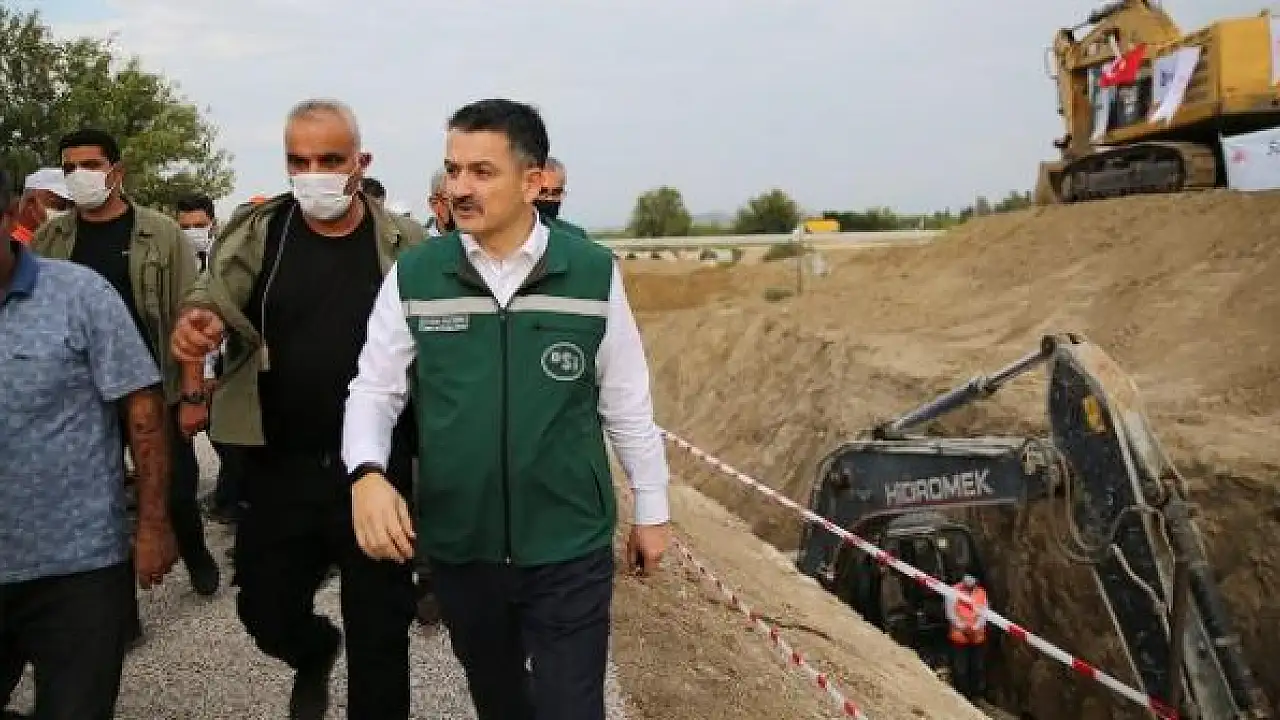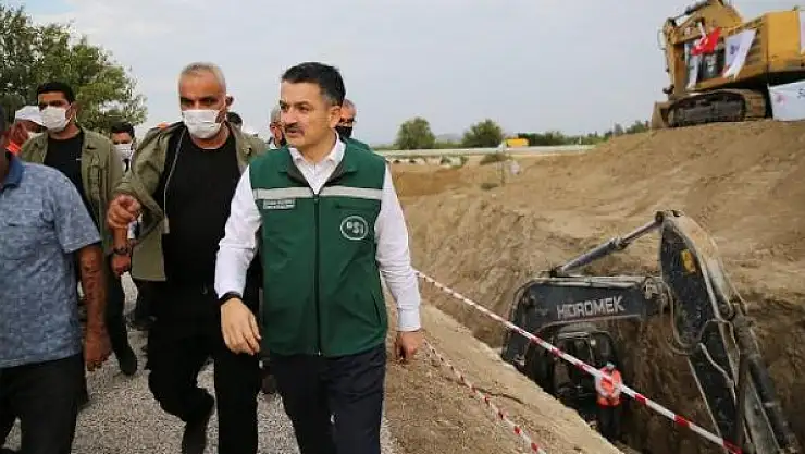 Açıklamasının ardından sahada incelemelerde bulunan ve yetkililerden bilgi alan Pakdemirli, iş makinesine binerek sulama borusunu kazılan alana yerleştirdi. Bakan Pakdemirli, işçilerle sohbet etti, hatıra fotoğrafı çektirdi.