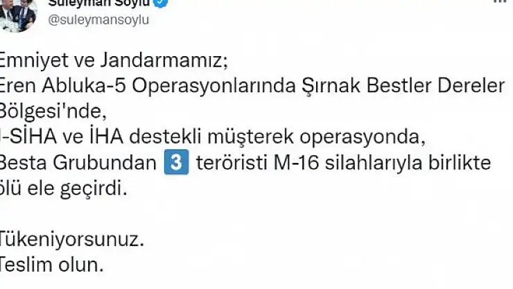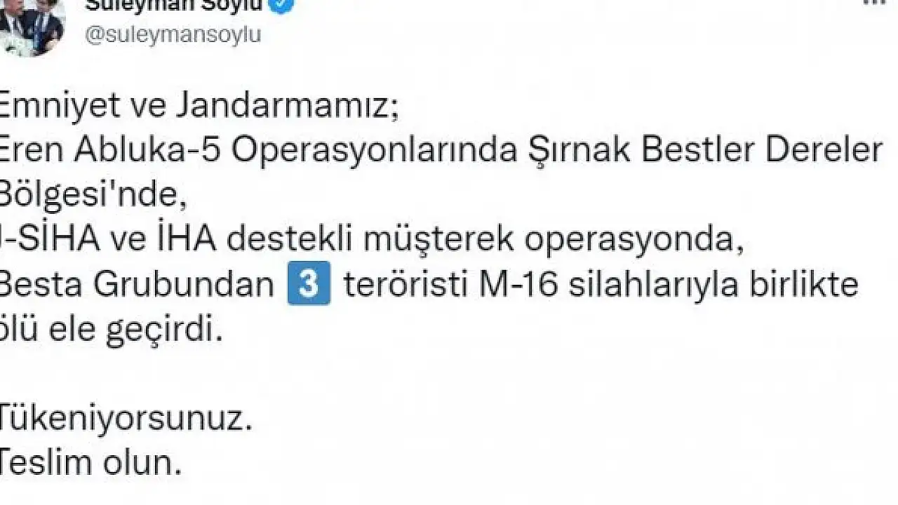 İÇİŞLERİ Bakanı Süleyman Soylu, Şırnak'ta jandarma silahlı insansız hava aracı (J-SİHA) ve insansız hava aracı (İHA) destekli operasyonla 3 teröristin etkisiz hale getirildiğini açıkladı.