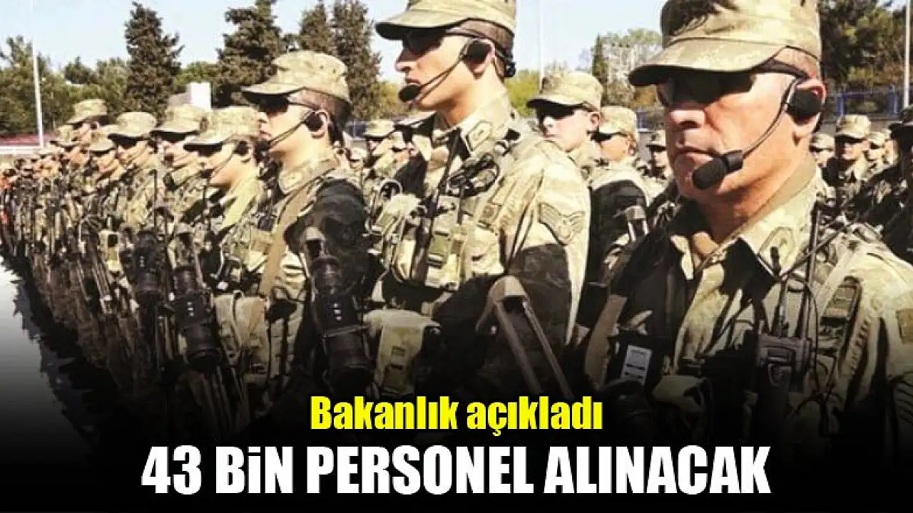 Milli Savunma Bakanlığınca yürütülen Türk Silahlı Kuvvetlerinin personel ihtiyacının karşılanmasına yönelik çalışmalar kapsamında bu sene 42 bin 938 personel alınacak. Bunların 3 bin 755'ini subay, 5 bin 375'ini astsubay, 13 bin 213'ünü uzman erbaş ve 20 bin 595'ini sözleşmeli erbaş ve erler oluşturacak.