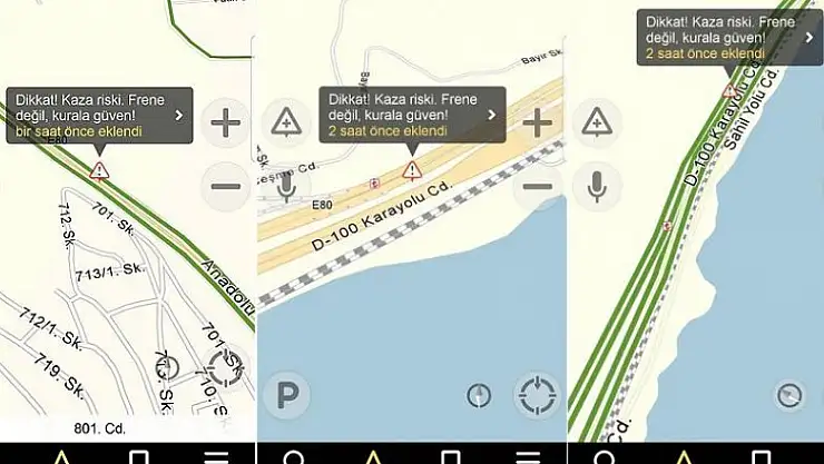 Uygulamayla, ölümlü kazaların yoğun yaşandığı yol güzergahında olduğu konusunda uyarılan sürücülere "Dikkat kaza riski! Frene değil, kurala güven" mesajı gösteriliyor.