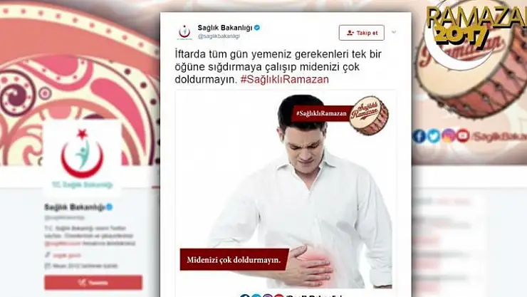 AA muhabirinin edindiği bilgiye göre, Sağlık Bakanlığı Sağlığın Geliştirilmesi Genel Müdürlüğünce, ramazan ayına özel #SağlıklıRamazan sloganıyla hazırlanan kampanya kapsamında, uzmanların beslenme ve fiziksel aktivite ile ilgili uyarılarından oluşan video ve görseller, iftar ve sahurdan önce paylaşılıyor.