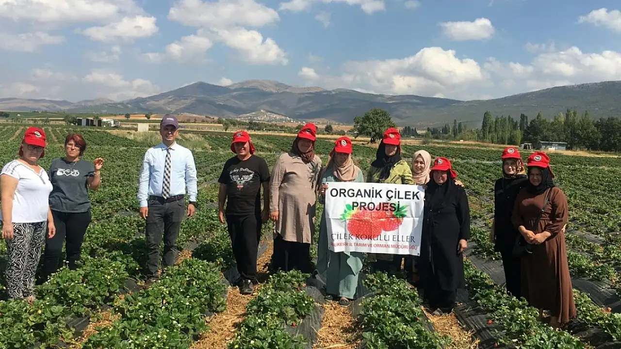 Balıkesir'de yürütülen "Çilek Kokulu Eller" projesi kapsamında, Balıkesir Tarım ve Orman İl Müdürlüğü görevlileriyle beraberlerindeki bir grup çiftçi Hüyük'teki çilek bahçelerini gezdi.