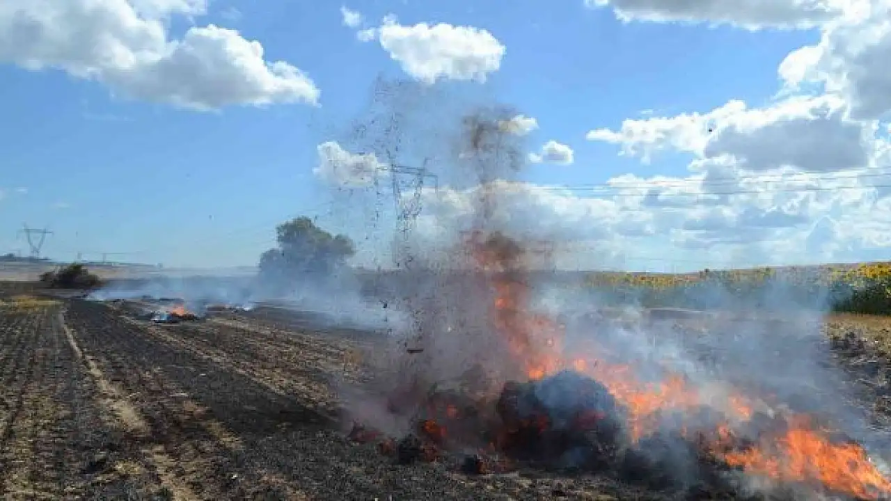 - Balya makinesinden sıçrayan kıvılcım 100 dönüm anız ile saman balyalarını küle çevirdi, arılar da zarar gördü