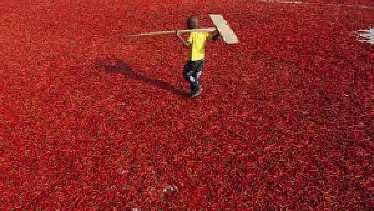 Tarlalardan toplanan kırmızı biberler güneşin altına serildikten sonra kurumaya bırakılıyor. Düzenli kurumayı sağlamak için belirli aralıklarla kırmızı biberleri karıştıran kadın işçiler; güneşin altında zor şartlarda çalışıyor. Çocuklarda annelerinin yakınlarında oyunlarına devam ediyor.