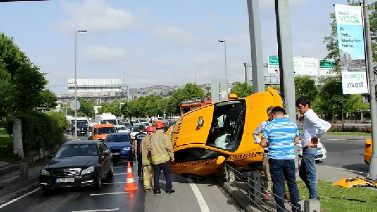 KAĞITHANE'de demir bariyerlere çarpan taksi bariyerde asılı kaldı.Sürücü yara almadan kurtulurken, Kağıthane Tüneli Bomonti istikametinde trafik oluştu.