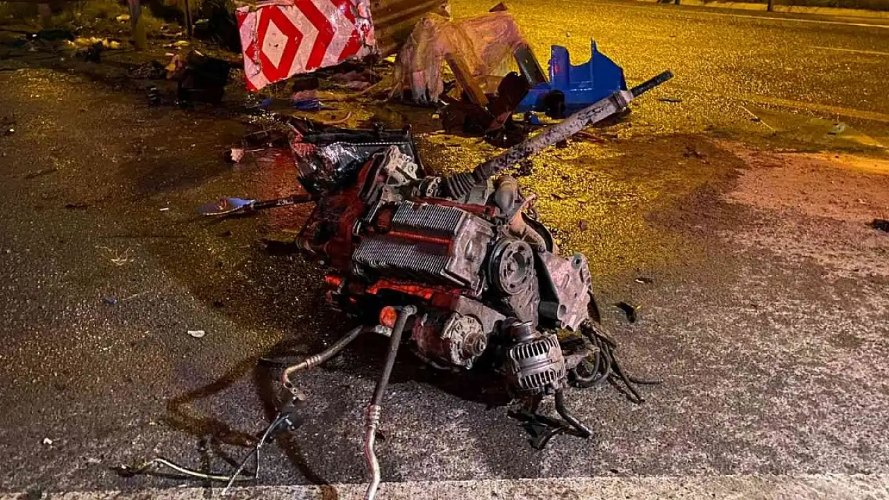Bariyerlere çarpan aracın motoru yola fırladı