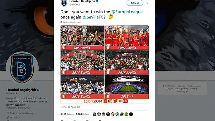 UEFA Şampiyonlar Ligi play-off turu ilk maçında yarın İspanya'nın Sevillatakımını konuk edecek Başakşehir Futbol Kulübü, rakibine esprili bir göndermede bulundu.