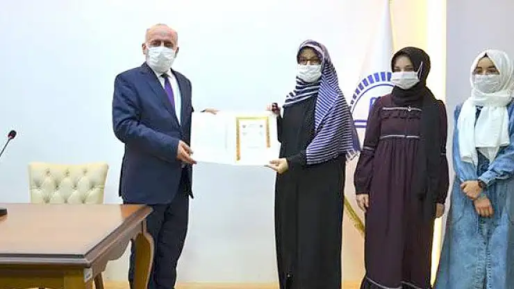 Öğrencilere Hafızlık Belgeleri ile Teşekkür Belgelerini takdim eden İl Müftüsü Poçanoğlu, sınavdan tam puan alan öğrencileri tam altınla ödüllendirdi. Sınavdan tam puan alarak tam altınla ödüllendirilen öğrenciler şu şekilde; Fadime Karagöz -Bedir Kız Kur'an Kursu, Fatıma Elif Çelik-Bedir Kız Kur'an Kursu, Afife Meryem Yağcı-Bedir Kız Kur'an Kursu, Büşra Bakır-Bedir Kız Kur'an Kursu, Fatmanur Açık- Hale Kız Kur'an Kursu, Nur Ay-Yaylapınar Kız Kur'an Kursu, Reyyan Kaçar -M. Fuat Binici Kız Kur'an Kursu, Fatma Miray Övseme-M. Fuat Binici Kız Kur'an Kursu, Ayşe Reyyan Alıcı-M.Fuat Binici Kız Kur'an Kursu, Fatmanur Eslem Akkaya -M.Fuat Binici Kız Kur'an Kursu, Ayşe Salah Al Yateem- Meydanlı Yatılı Kız Kur’an Kursu, Sudenur Bozkurt -Seydişehir Yunus Emre Kız Kur'an Kursu, Rukeye Ensari -Kurs dışından.