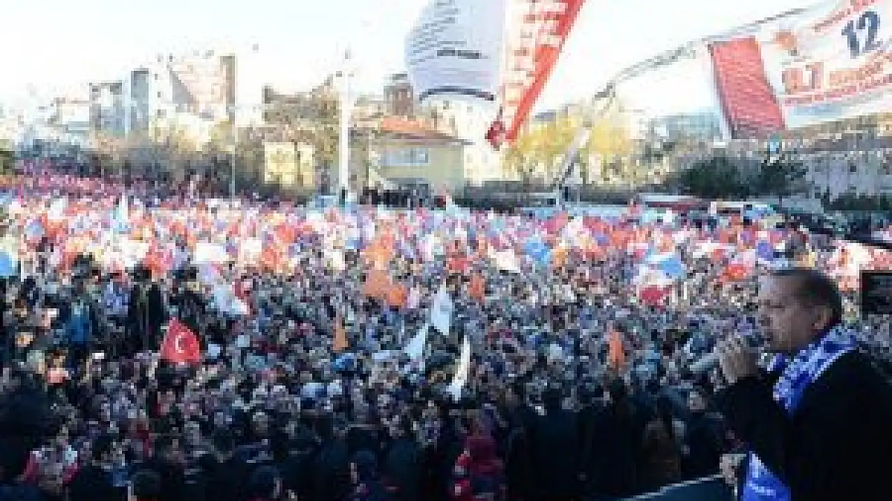 "Şimdi paletli ambulanslarımız var mı? Helikopter ambulanslarımız var mı? Hemen alıp gerektirdiği yere getirebilecek imkana sahibiz. İşte bütün bu adımları niçin attık? Bir aşk uğruna, bir sevda uğruna. 'Biz bu milletin hizmetkarıyız' dedik, onun uğruna. Lafla olmaz bu, uygulamayla olur. 3,5 sene iktidarda kal, kaç git. 5 sene yapacaktın bu işi. Niye 5 sene kalmadın? Şu MHP'ye 30 Mart'ta gereken cevabı vereceğinize inanıyorum. BDP'ye gereken cevabı vereceğinize inanıyorum. Kürt kardeşlerime şunu söylüyorum, ne olur siyasi Kürtçülük yapmayın, bu oyunu gelin bozun, hizmete oy verin, size hizmetkar olana oy verin, ideoloji karın doyurmuyor."