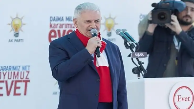 Uşak halkının 16 Nisan’da 'evet' oyu vereceğini belirten Yıldırım, “Milletimiz için demokrasi için önemli bir halkoylaması var. 16 Nisan’da önemli bir oylama var. Uşak’ın 16 Nisan’a hazır olduğunu görüyorum. Türkiye gelecek hedeflerine, 2023 hedeflerine, büyük Atatürk’ün işaret ettiği muasır medeniyetler seviyesine bu anayasa ile gidip değiştireceğim diyeceksiniz. Uşak işi bitirmiş ve size yakışanı yapıyorsunuz. Şu anda Cumhurbaşkanımız, Allah’a şükür işbaşında ve memleket için gece gündüz demeden gayret ediyor. Başbakan kardeşiniz gene canla başla çalışıyor. Bakanlarımız, meclisimiz çalışıyor ve hep gayret ediyoruz. Amacımız memleketin daha ileriye gitmesi ve milletimizin dertlerine derman olmak ve sorunlarını çözmek. Şu anda bir sorun var. Sorun yok deniliyor. Tamam şu anda sorun yok ama bu böyle olacak diye bir garanti yok. Niye? Bakın 7 Haziran’da seçim oldu ve hiçbir parti tek başına iktidar olacak çoğunluğu alamadı. Ama HDP diye bir parti çıktı ve bizim arkamızda kandil var sizi bir kaşık suda boğarız dedi. Türkiye’ye meydan okudu. Öyle bir değişiklik getirelim ki tek başına bir hükümet çıksın. İşi şansa bırakmayalım. Bugün AK Parti ve yarın başka birisi olsun. Tek başına güçlü iktidar olunsun. Bu bölgede güçlü olunmazsa işimiz zor ve biz bunun mecburiyetindeyiz. Onun için bu değişikliği getirdik” dedi.