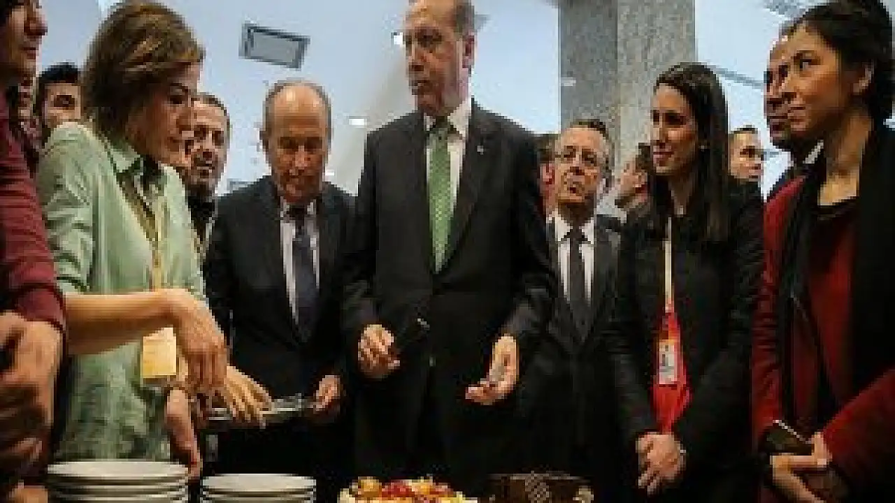Haliç Kongre Merkezi'ndeki Vakıf Katılım Bankası Açılış Töreni'ne katılan Erdoğan, konuşmasının ardından doğum günü sürpriziyle karşılaştı.