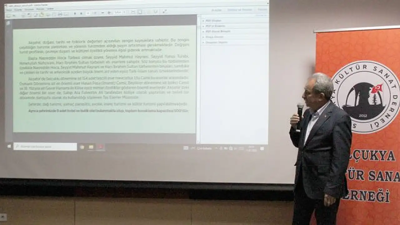 Programın açılış konuşmasını gerçekleştiren Selçukya Kültür Sanat Derneği Başkanı Av. Fatma Şeref Polat, “Selçukya Kültür Sanat Derneği olarak baştan beri yürüttüğümüz kültür anlayışımız önce kendi şehrimizi, kendi mahallemizi, kendi köyümüzü, kendi ilçelerimizi yani yerelimizi çok iyi tanımak üzerine kuruluyor. Şuna inanıyoruz ki; kendi çevresini bilmeyen, kendi şehrini bilmeyen milli veya evrensel bir değer üretemez. Her ağaç kendi kökleri üzerinde yükselir. Nasrettin Hocamızla birlikte adından söz ettiren Akşehir aynı zamanda dünyanın merkezi olarak ispat edilmiştir. Aksini ispat edebilen henüz olmamıştır. Aynı zamanda batı cephemizin eşsiz karargahı, romanlara, şiirlere, dizilere konu olmuş Akşehir’le ilgili eminim ki birçok bilgilerimiz eksik ve bunu da Sayın Başkanımızdan dinlemek bize büyük bir katkı sağlayacaktır. Devam eden ilçe programımızla birlikte Konya’mızı çok daha geniş bir çerçeveyle hep beraber tanımış olacağız. Bu da şehrimize ayrı bir güzellik ve katkı sağlayacak diye düşünüyorum” şeklinde konuştu.
