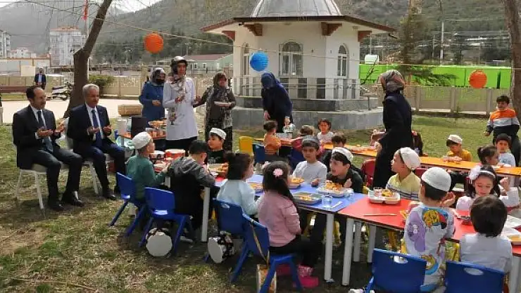 Tekne orucu tutan minikler öğle ezanının okunmasıyla iftar yaparken başkan Akkaya ve Müftü Müjdeci öğrencilerin iftar duasına katılıp, onlara minik sahur davulları hediye etti.