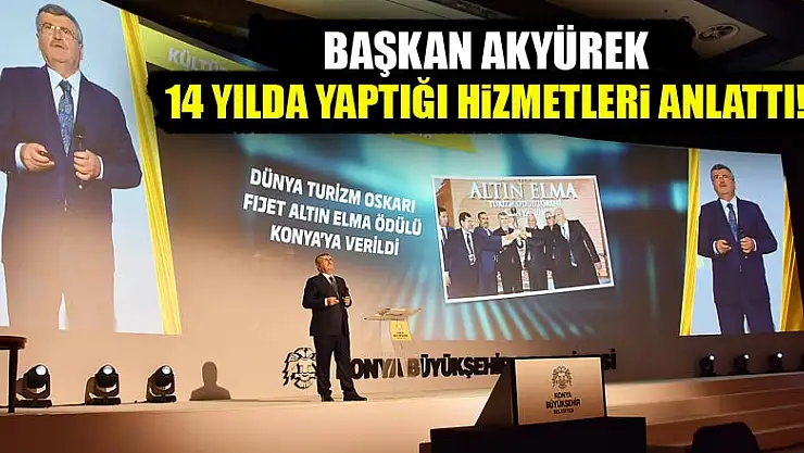 Konya Büyükşehir Belediye Başkanı Tahir Akyürek, 14 yıllık görev süresi boyunca hayata geçirdikleri büyük yatırımları ve projeleri düzenlediği programda anlattı.