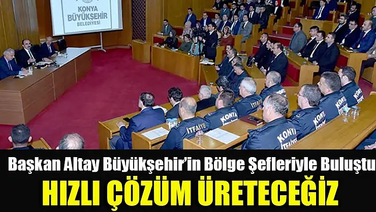 Konya Büyükşehir Belediyesi KOSKİ Genel Müdürlüğü ile Fen İşleri, İtfaiye, Çevre Koruma ve Kontrol, Kaynak Geliştirme ve İştirakler, KOMEK ve ASEM birimlerinin bölge yöneticilerine hitap eden Başkan Altay, Yeni Büyükşehir Yasası kapsamında sorumluluk alanına giren ilçe ve beldeleri ziyaret ettiklerini belirterek, bu ziyaretleri rutin hale getirip sıklıkla istişarelerde bulunacaklarını ifade etti.