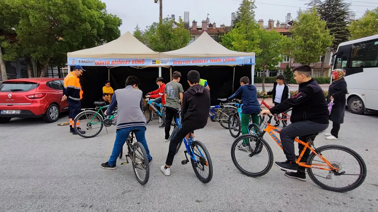 Konya Büyükşehir Belediyesi'nin 3 Haziran Dünya Bisiklet Günü etkinlikleri kapsamında şehrin farklı noktalarında kurduğu bisiklet tamir çadırları 4 Haziran akşamına kadar bisiklet kullanıcılarına ücretsiz hizmet verecek.