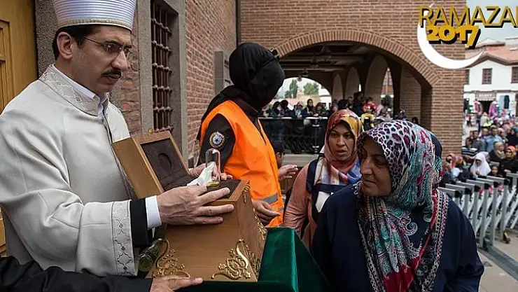 Özel bir bohçada caminin avlusuna getirilen Sakal-ı Şerif, salavatlar eşliğinde açıldı. Saatler öncesinden sıraya giren ve uzun kuyruklar oluşturan vatandaşlar, özel cam kabın içerisindeki Sakal-ı Şerif'i görme imkanı buldu.