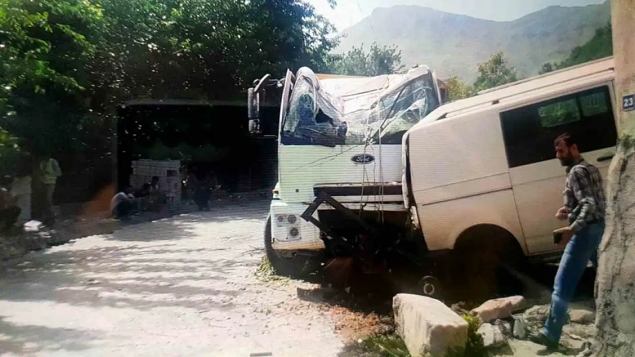 Batman'ın Sason ilçesinde şoförünün terk ettiği kamyon, yokuş aşağı son sürat park halindeki bir aracı da önüne alarak yol kenarındaki bir eve çarparak durabildi.