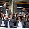 Futbolcular, balkonda şampiyonluk kupasını kaldırarak belediyenin önünde toplanan binlerce taraftarla şarkılar söyledi.