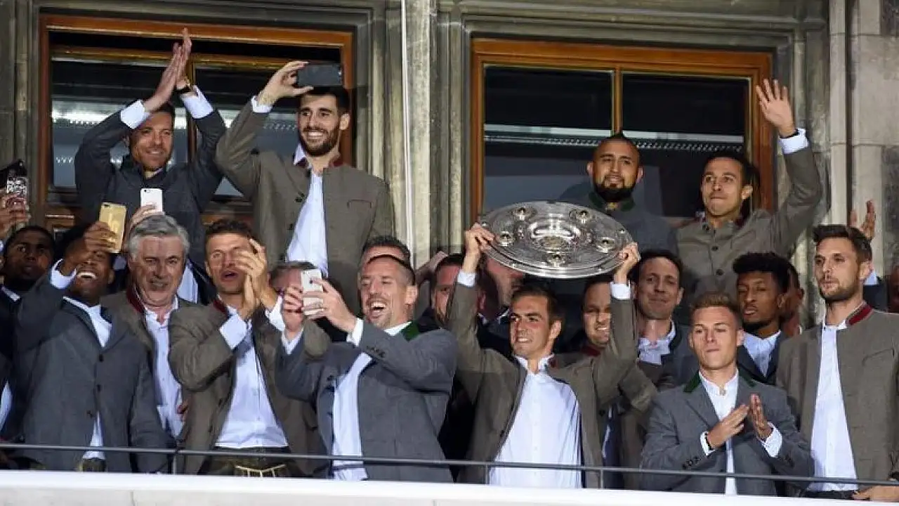 Statta başlayan şampiyonluk kutlamaları, şehrin merkezindeki Marienplatz Meydanı'nda devam etti. Kırmızı-beyazlı futbolcular, teknik kadro ve kulüp yöneticileri Bavyera eyaletinde giyilen geleneksel kıyafetlerle belediye binasının balkonuna çıktı.