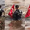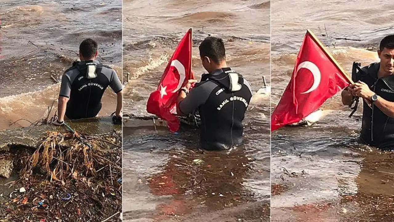 Muğla'nın Marmaris ilçesinde yağışlar nedeniyle karaya oturan bir teknedeki bayrak, selin getirdiği çamurun içinde kaldı. Bölgeye gelen Dalış Emniyet Güvenlik Arama Kurtarma (DEGAK) timi, denize girerek bayrağı bulunduğu yerden aldı.