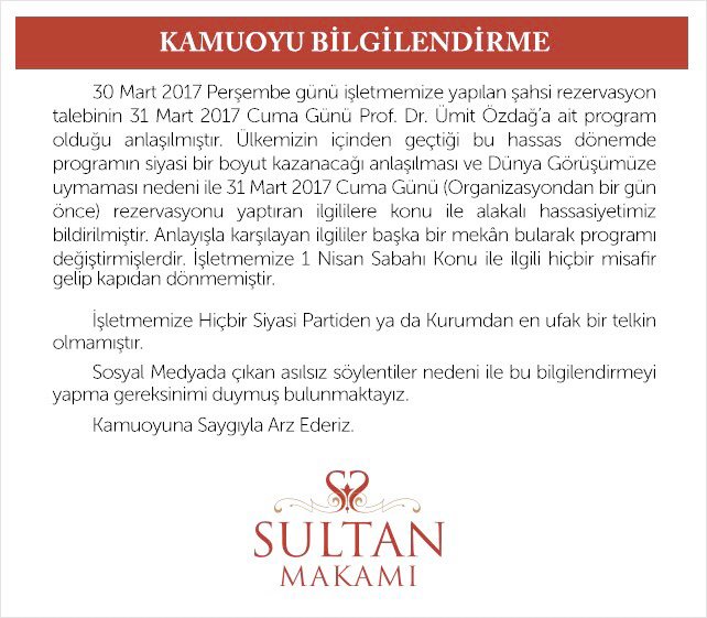 Sultan Makamı Prof. Dr. Ümit Özdağ’ın Sultan Makamında kapıdan döndürüldüğü ile ilgili sosyal medyada çıkan haberlere açıklık getirdi. Konu ile ilgili konuşan Sultan Makamı yetkilisi Hüseyin Barınlı,“30 Mart Perşembe günü işletmemize yapılan şahsi rezervasyon talebinde bulunulmuş. Biz de bu rezervasyon talebinin 31 Mart Cuma günü Prof. Dr. Ümit Özdağ’a ait bir program olduğunu öğrendik. Ülkemizin içinden geçtiği hassas dönemi de göz önünde bulundurarak programın siyasi bir boyut kazanacağını ve bunun dünya görüşümüze uymayacağını belirterek programdan bir gün önce rezervasyonu yapan ilgililere ulaşarak hassasiyetimiz bildirildi. Programın iptal edilmesi ile ilgili de hiçbir kurum veya kişiden bizlere bir telkin de gelmedi. İletişime geçtiğimiz ilgililer de bu durumu anlayışla karşılayarak programlarında değişikliğe gitmişlerdir.