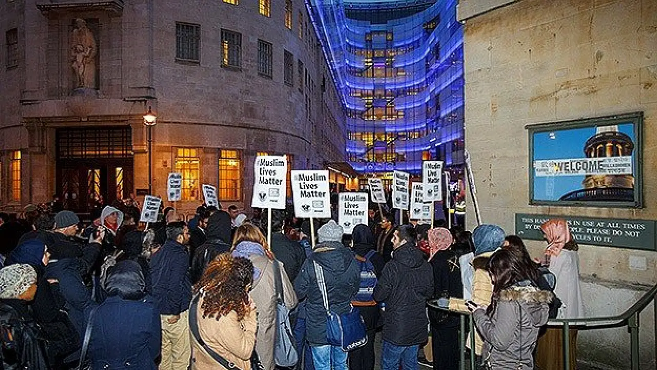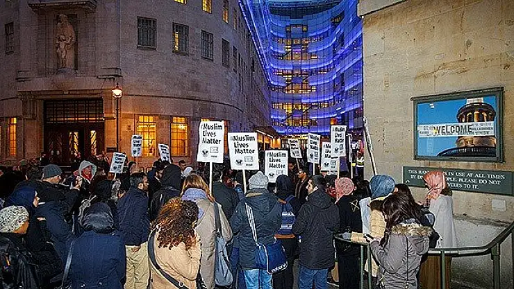 "Irkçılığa Karşı Dur" isimli kampanyayı yürüten grup tarafından düzenlenen gösteri için protestocular, başkent Londra'daki BBC Genel Merkezi önünde toplandı.