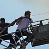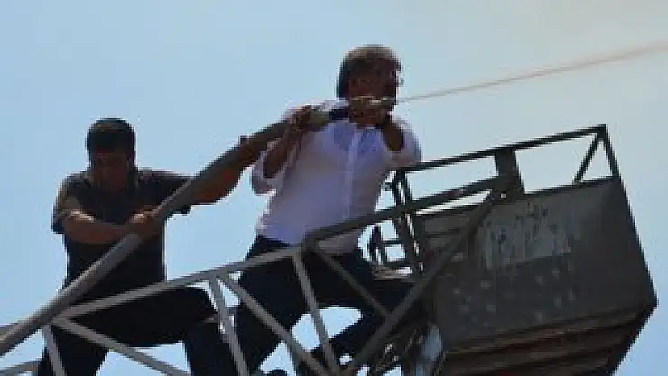 Kayseri'nin Akkışla ilçesinde çıkan ve 5 bin adet saman balyasının kül olduğu yangına Akkışla Belediye Başkanı Ali Ergül itfaiye merdivenine çıkarak müdahale etti.
