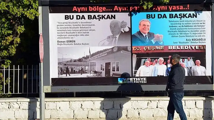 Büyükşehir Yasası gereği bazı kamu alanlarının Fethiye Belediyesinden alınarak Büyükşehir Belediyesine devredilmesini eleştiren Fethiye Belediye Başkanı Behçet Saatcı, ilçedeki 15 mahalleye Muğla Büyükşehir Belediye Başkanı Osman Gürün ile İzmir Büyükşehir Belediye Başkanı Aziz Kocaoğlu'nu kıyaslayan ilan panosu astırdı.