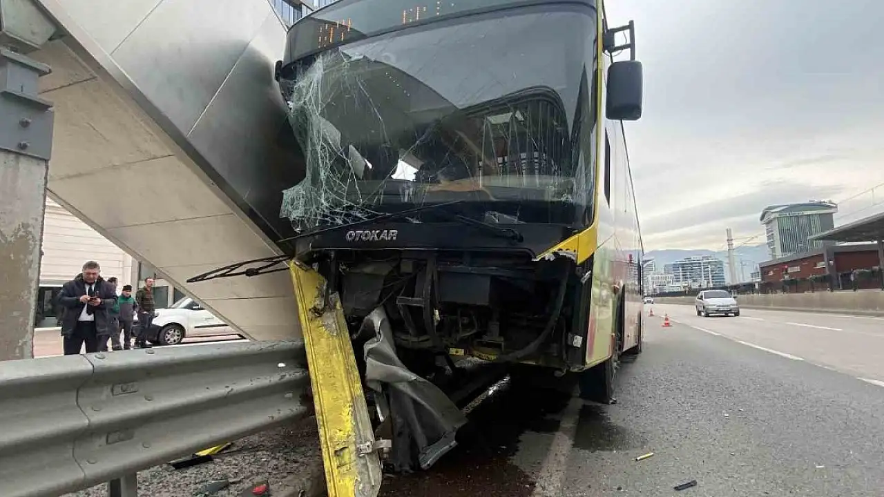 Bursa'da sürücüsünün kontrolünden çıkan belediye otobüsü bariyerlere ok gibi saplanırken, kazada 5 yolcu yaralandı.