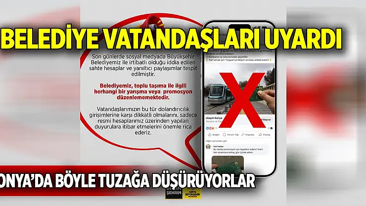 Son günlerde birçok sahte sosyal medya hesaplarından Konya Büyükşehir Belediyesi ulaşımıyla ilgili tuzağa düşüren paylaşımlar yapılmaya başlandı.
