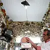 Berber dükkanına gelenler, deniz kabuklarından salyangozlara, pinalardan deniz süngerlerine, yunus balığı başından deniz dikenlerine ve kurutulmuş balıklara kadar farklı deniz canlılarından oluşan ortamda tıraş oluyor.