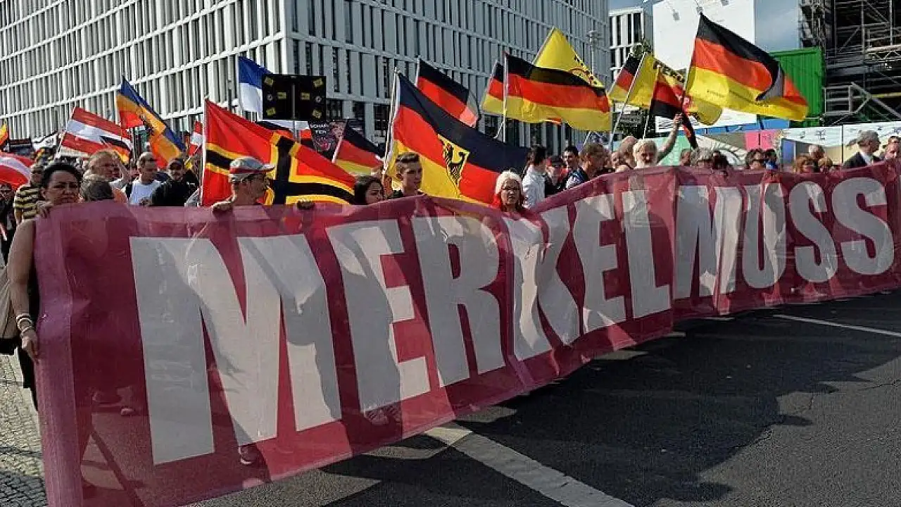 Merkez tren istasyonu önünde toplanan binin üzerinde aşırı sağcı, Almanya Başbakanı Angela Merkel’in sığınmacı politikasını protesto etti.