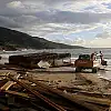 Sahilde iş makinesi yardımıyla dalgaların etkisini azaltmak için çalışma yapıldı.