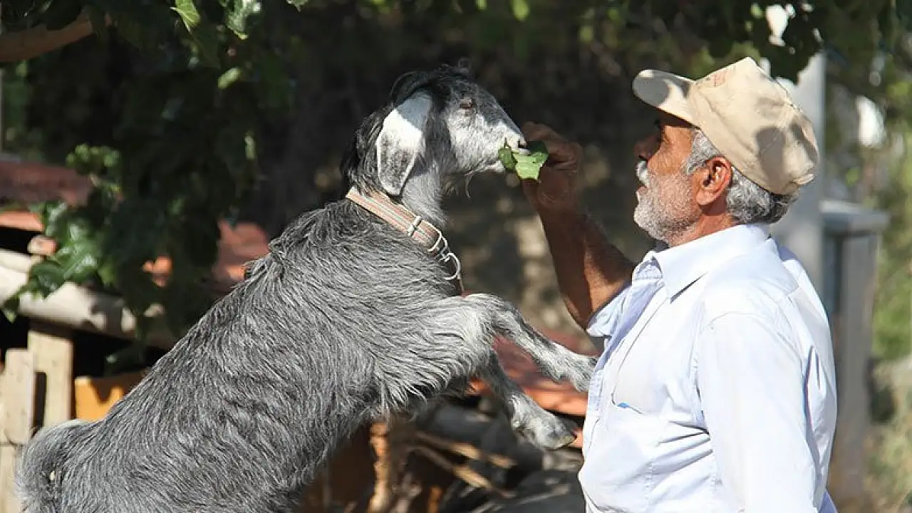 Besleyip büyüttüğü oğlak yaşlı adamın peşinden ayrılmıyor