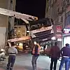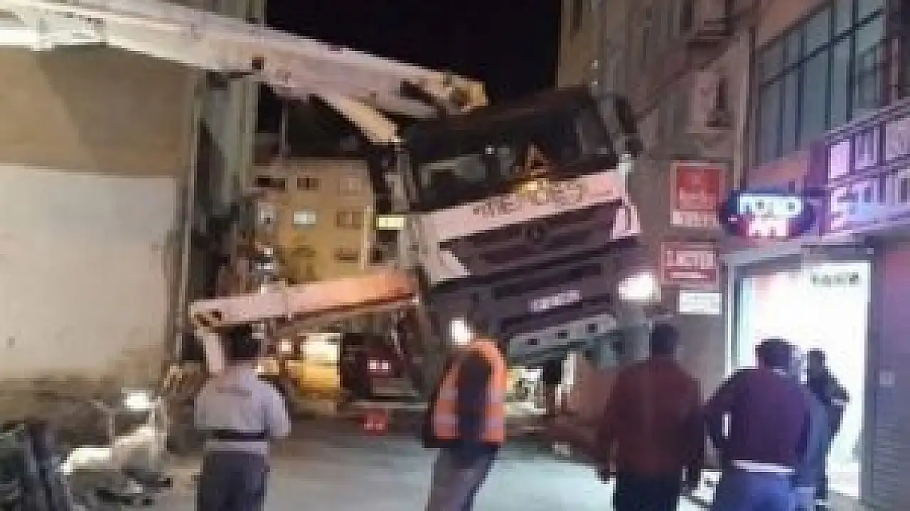 Kuşadası'nda şehir merkezinde sokak üzerinde hiçbir önlem almadan bir inşaata hazır beton dökmek için kullanılan beton mikseri, ağırlık merkezinin doğru ayarlanamaması nedeniyle inşaatın yönüne devrilerek askıda kaldı.