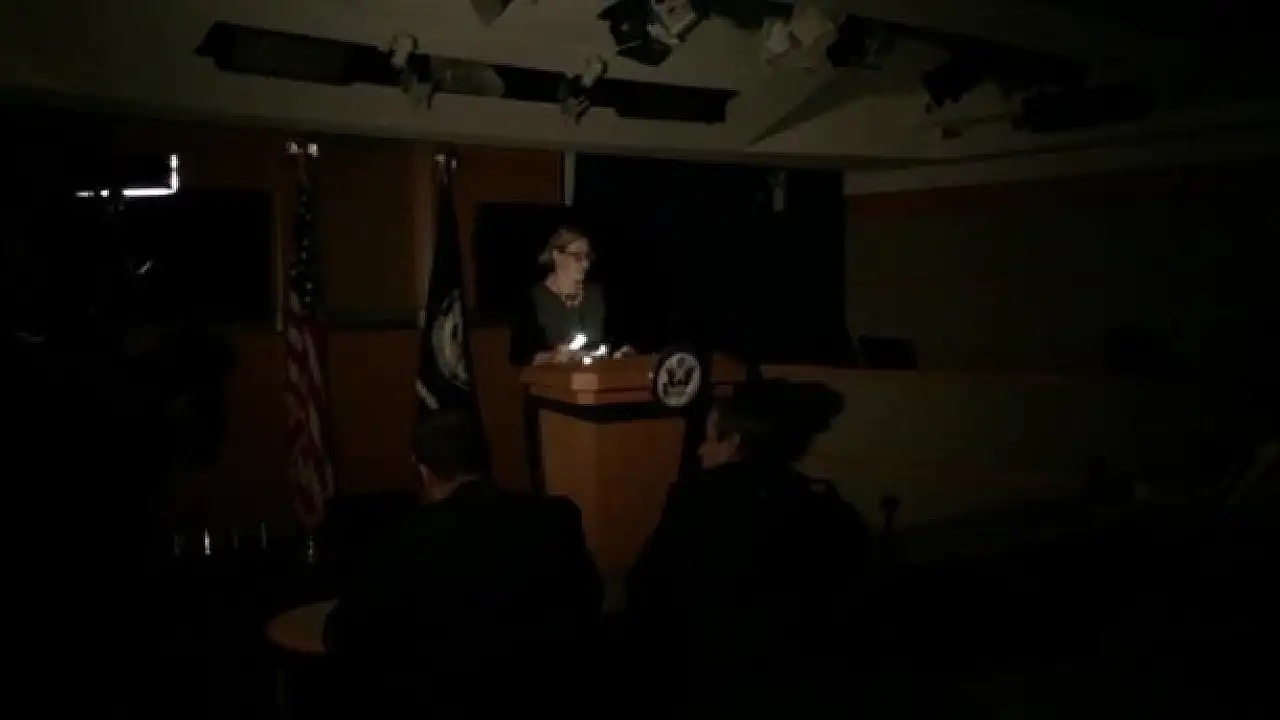 Elektrik kesintisi nedeniyle, Dışişleri Bakanlığı Binası'nda gazetecilerin sorularını yanıtlayan Dışişleri Bakanlığı Sözcü Vekili Marie Harf, basın toplantısını cep telefonunun ışığıyla sürdürmek zorunda kaldı.