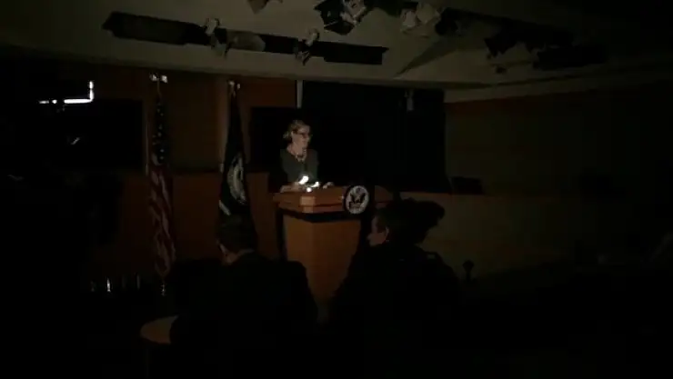 Dışişleri Bakanlığı'nın günlük basın brifinginde elektrikler aniden kesilince Sözcü Marie Harf, toplantıyı sona erdirmek zorunda kaldı. Brifingde bulunan gazeteciler de kesintiyi toplantıdan fotoğraflarla sosyal medyadan paylaştı.