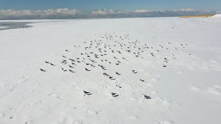 Gölün yüzeyini kaplayan beyaz örtü üzerinde sürüler halinde hareketsiz vaziyette bekleyen martıların, yiyecek sıkıntısı çektiği görüldü. Bazı vatandaşlar ise aç kalan martılara ekmek atarak beslemeye çalıştı.