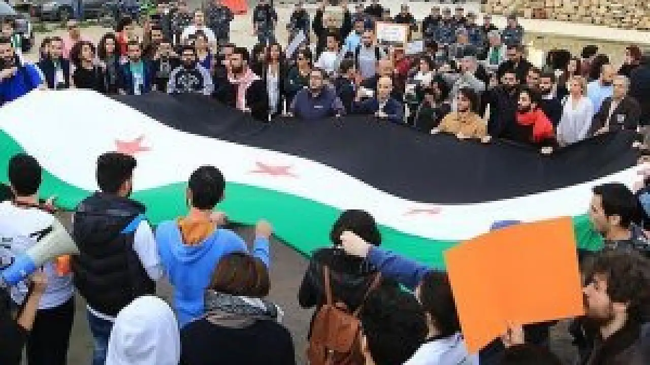 Suriye rejimi ve işlediği insanlık suçları aleyhine slogan atan grup, "Hain, Golan dışında barış yapmıyor","Mültecilere yapılan yardımlar, sorumlular cevap verin", "2011'de başlayan Suriye iç savaşı değil, Suriye devrimi" yazılı dövizler taşıdı. Grup, benzer şekilde Suriye'de birçok bölgeyi kontrolü altında tutan DAEŞ terör örgütü aleyhinde de slogan attı.